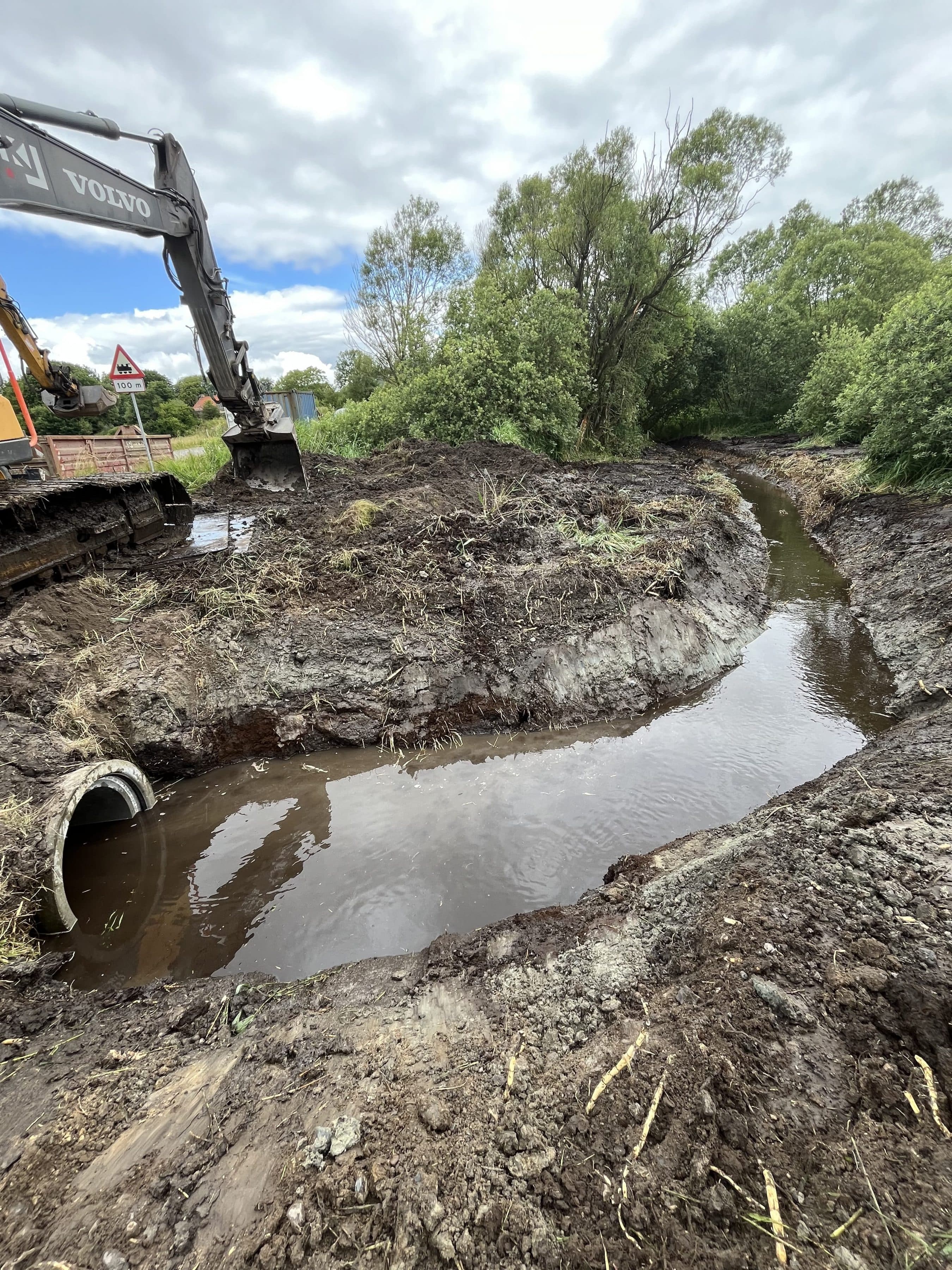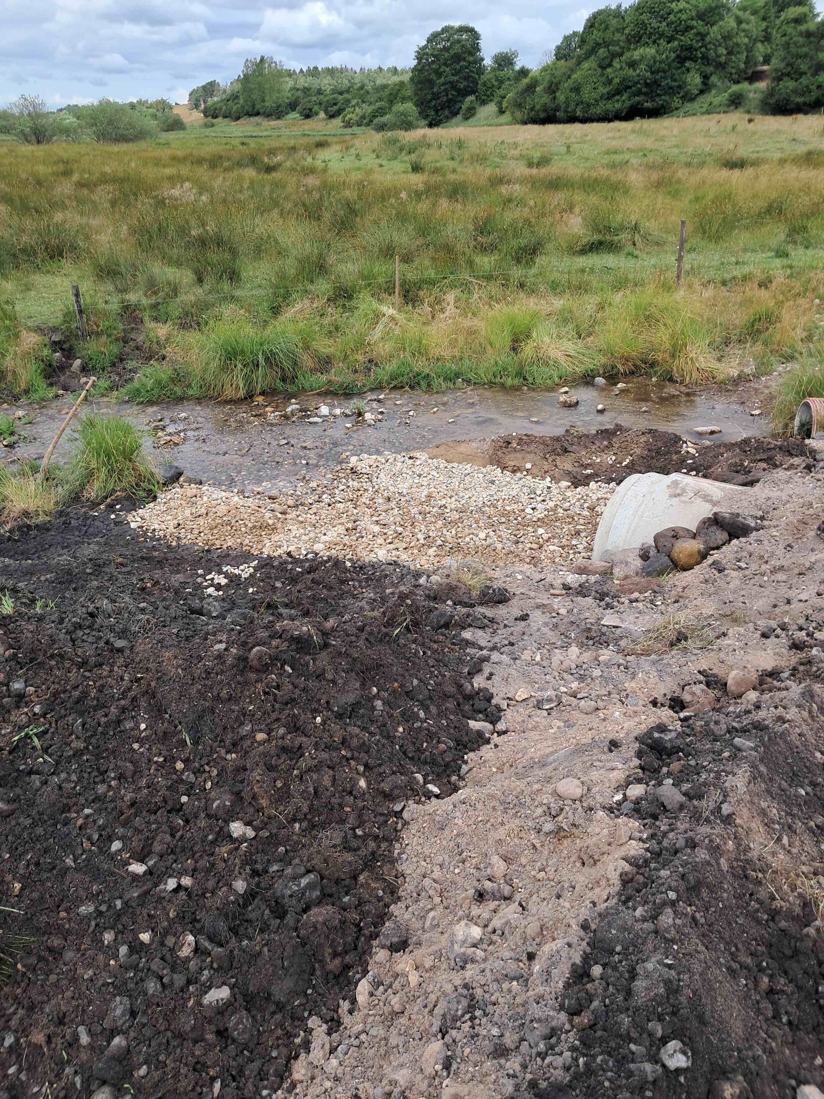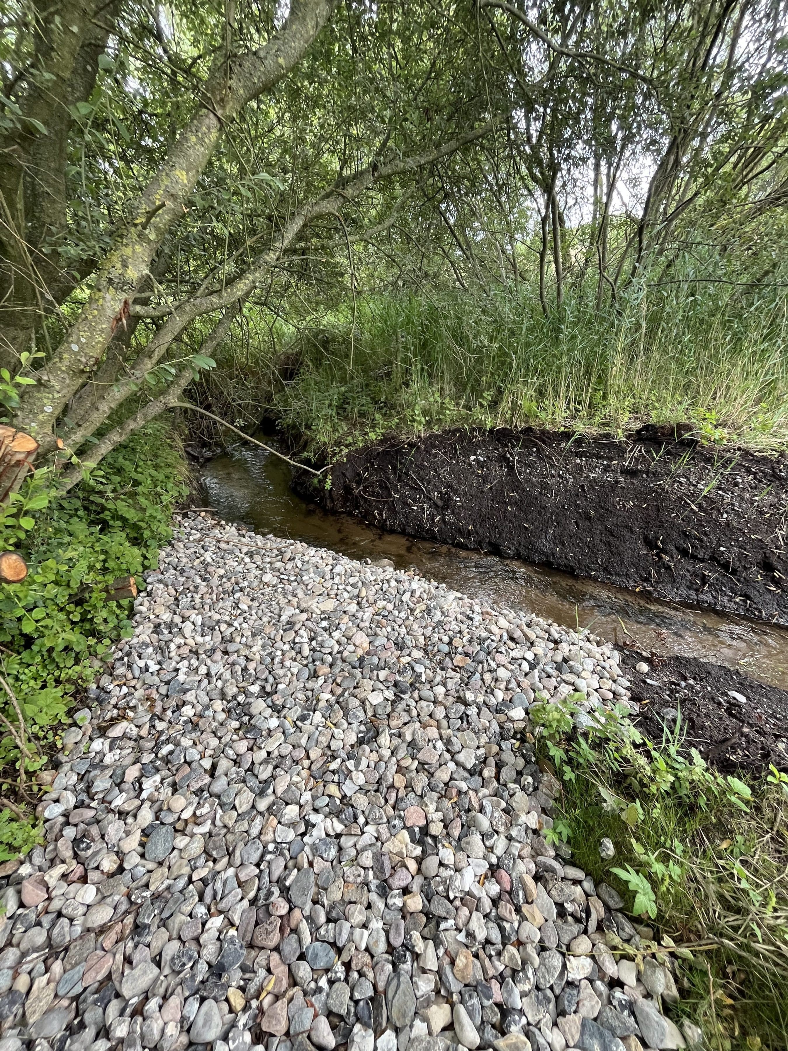 Omlægning og genslyngning af ca. 85 m bæk, 20m Ø900 betonledning (underføring) ca. 20 m3 gydegrus, 75 m2 asfalt.