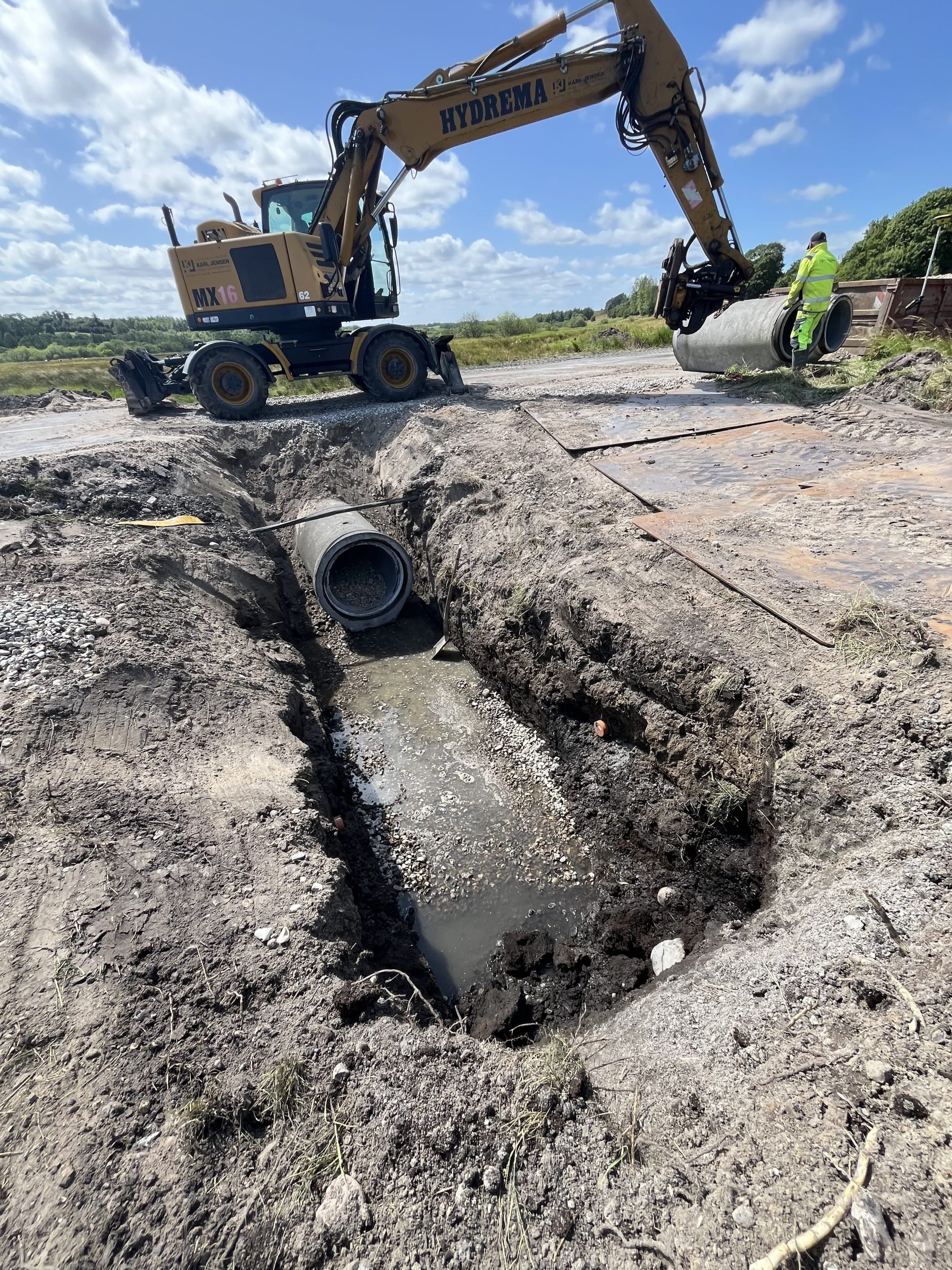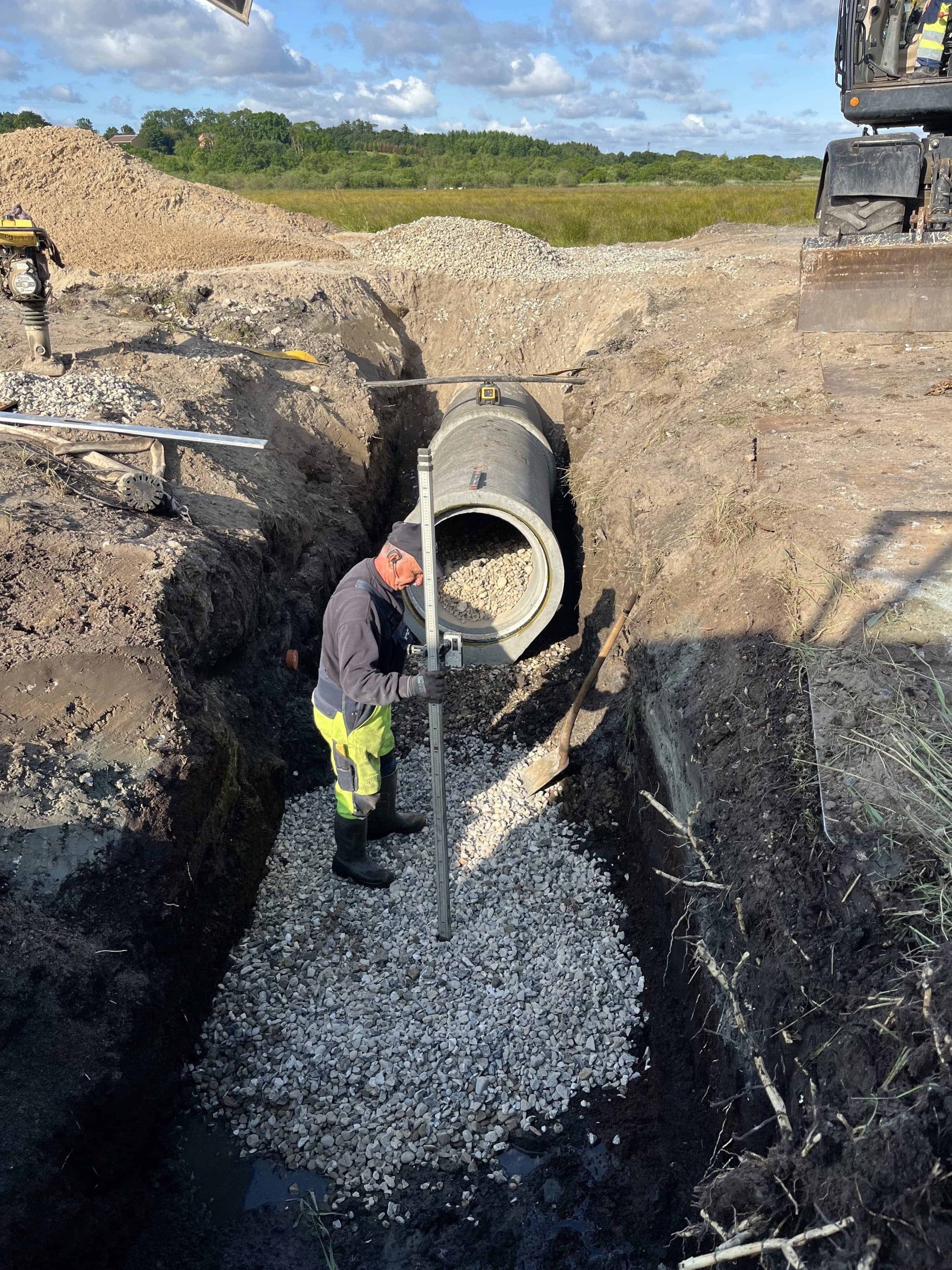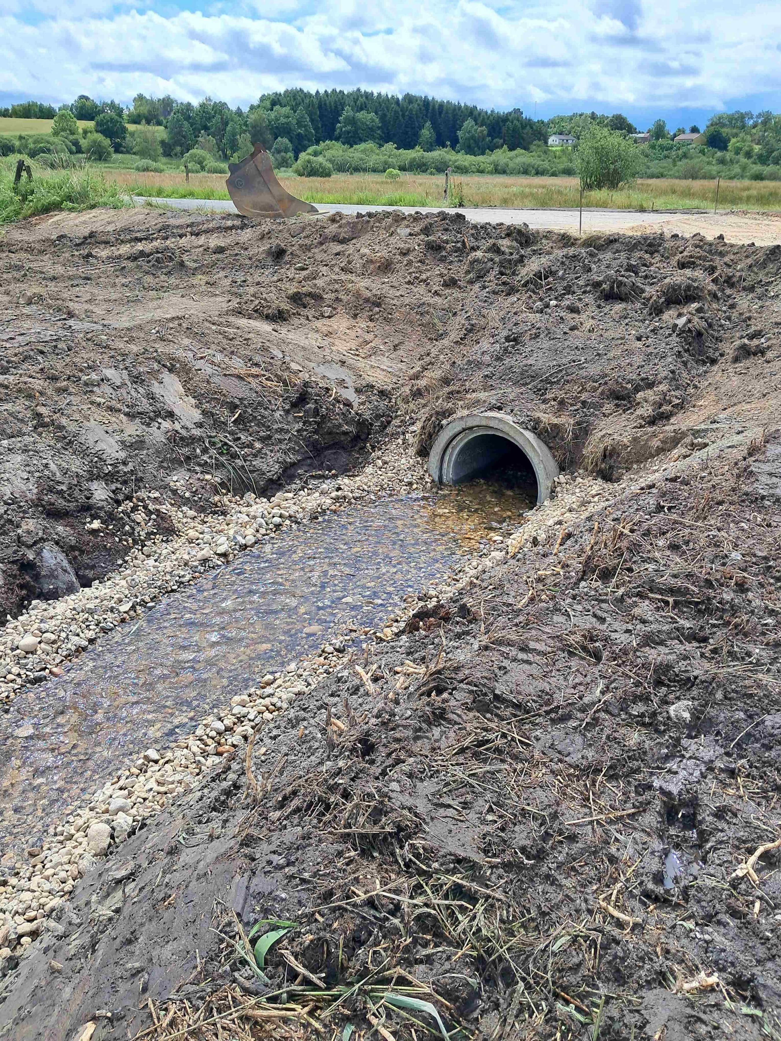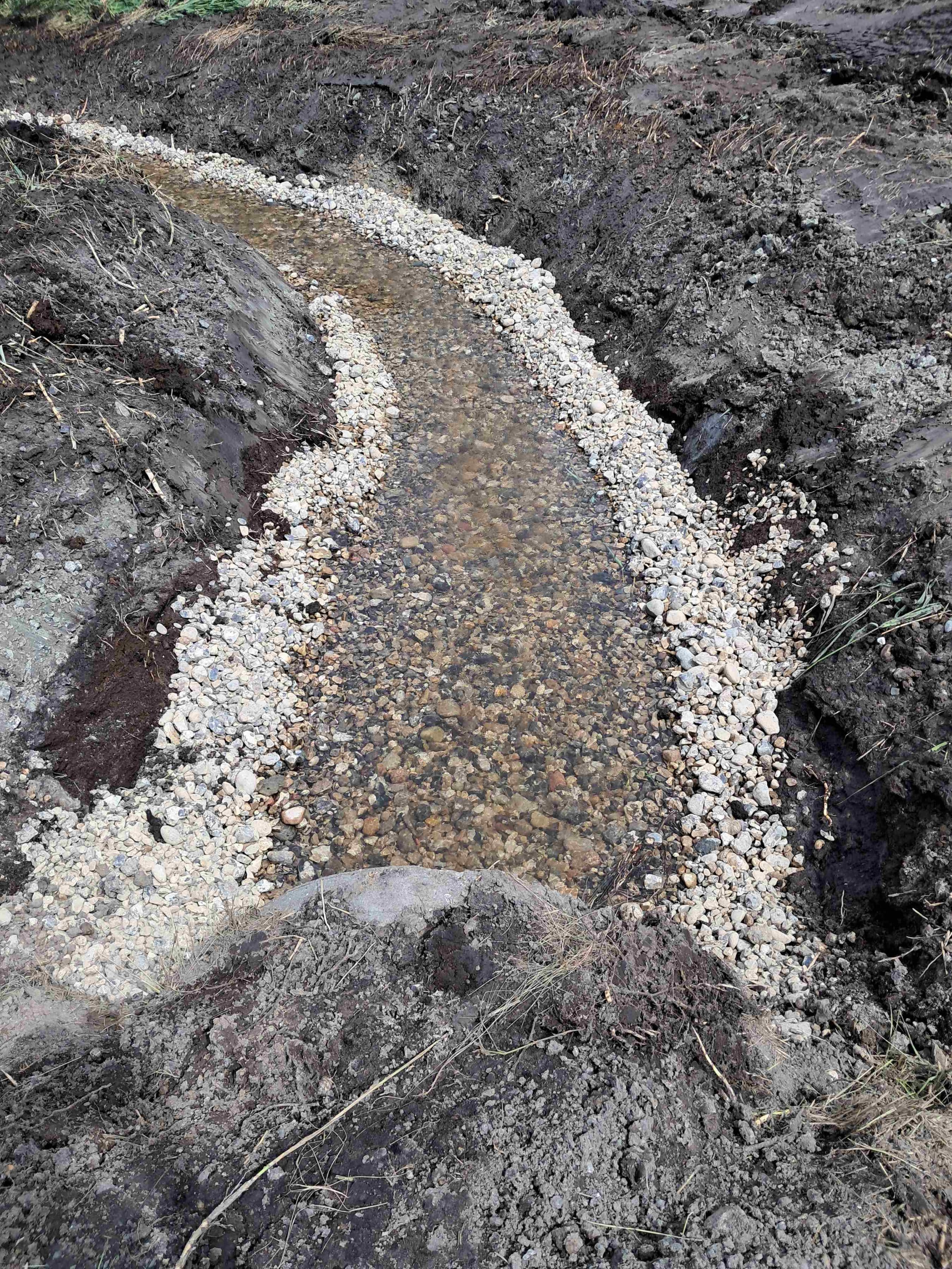 Omlægning og genslyngning af ca. 85 m bæk, 20m Ø900 betonledning (underføring) ca. 20 m3 gydegrus, 75 m2 asfalt.